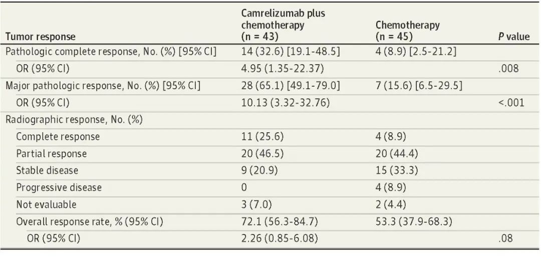 北京时间8月3日,尊龙凯时Ag医药创新药卡瑞利珠单抗联合化疗(Cam+CT)对比化疗(CT)新辅助治疗ⅢA/ⅢB (T3N2) 期非小细胞肺癌(NSCLC)结果在线发表于国际权威期刊JAMA Oncology[1]。该研究是由空军军医大学唐都医院姜涛教授、雷杰教授团队联合陕西省肿瘤医院雷光焰教授团队、兰州大学第二附属医院王成教授团队共同参与的一项随机对照、多中心、Ⅱ期临床研究(TD-FOREKNOW,NCT04338620)。研究结果显示,与化疗相比,卡瑞利珠单抗联合化疗新辅助治疗NSCLC显著提高了病理完全缓解(pCR)率(32.6% vs 8.9%,OR=4.95,95% CI :1.35-22.37, P =0 .008),且安全性良好。本研究是卡瑞利珠单抗新辅助治疗可切除NSCLC患者的首个随机对照研究,为NSCLC新辅助免疫治疗再添新证。